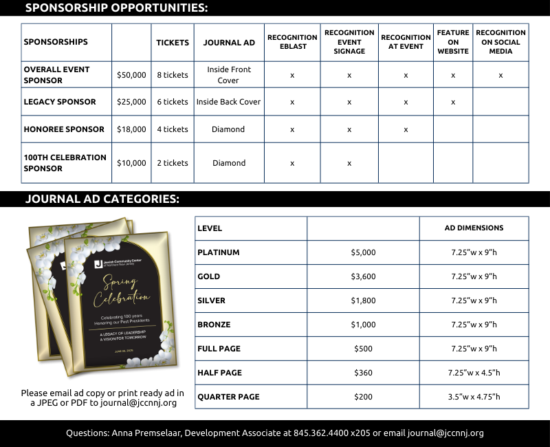 The JCC of Northern New Jersey extends our deepest gratitude to everyone who supported our 2nd Annual Spring Celebration – commemorating 100 years of community and honoring 14 extraordinary Past Presidents.
